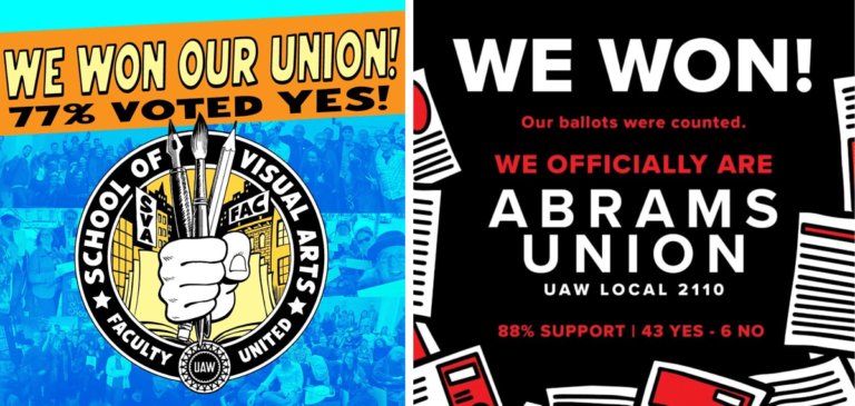 • SVA’s unionization efforts have been recorded on their Instagram account, saying that SVA is one of the last art universities to assemble the union. Instructor Joan Hilty is one of many who described the movement and represents over 1,200 instructors.