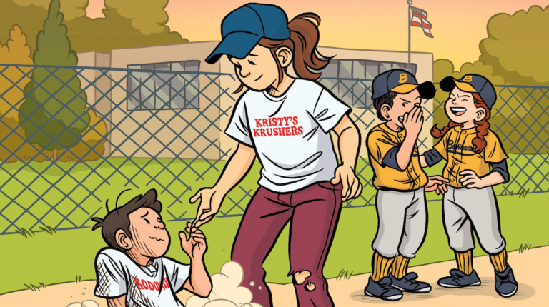 The Beat spoke to Crenshaw via email to learn more about Christie and Walking Disaster. We learn about her personal history on The Baby-Sitters Club, the impressive panel layouts she uses to depict softball games, and how her parents influenced her chosen career path as an artist. We asked them all about their support.