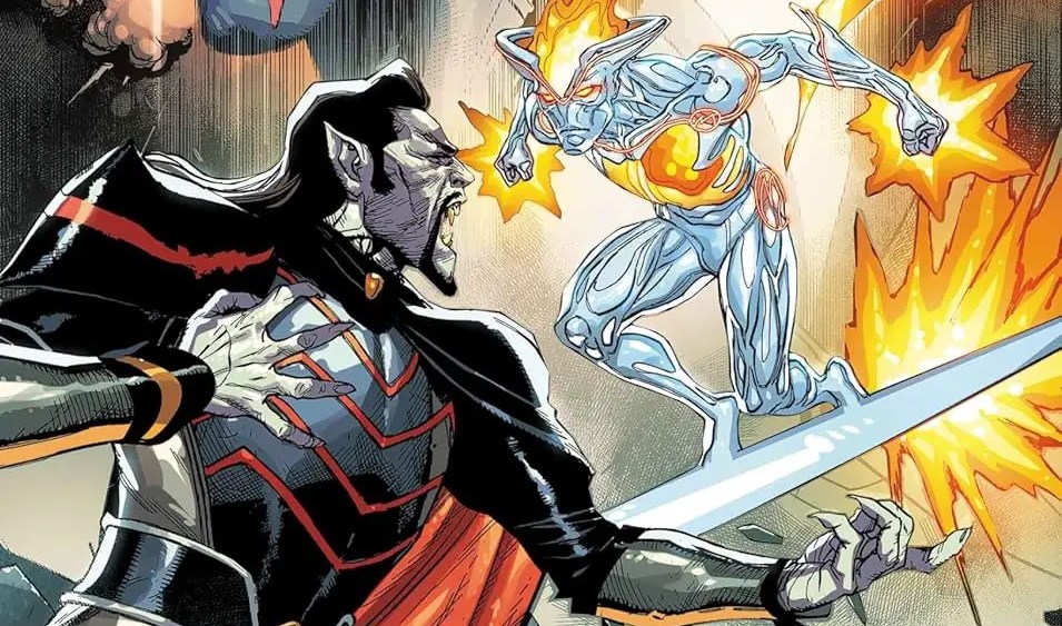 Conquest 2099 #3 depicts an all-out galactic war between Dracula and the spider-like alien conqueror Araneon. Screenplay by Steve Orlando, art by Ibraim Roberson, Jose Luis, Oren Jr., and Andrew Dalhouse. Araneon destroyed Domus Draconum, Dracula’s homeworld. Hungry for revenge and obsessed with annihilating Araneon, Dracula rampages through the galaxy aboard the monolithic space destroyer Trinelance, killing every Araneon he sees in the world.
