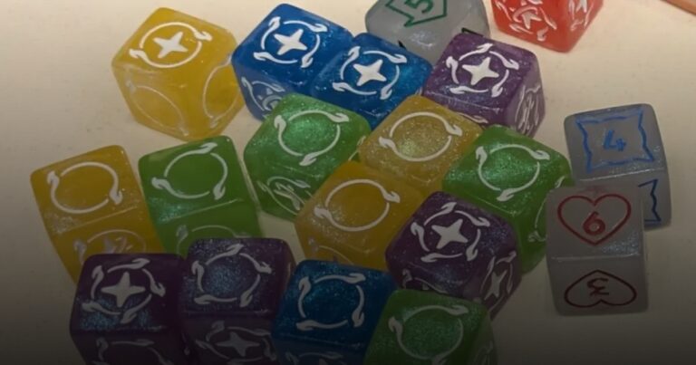 Every 20 Strong game consists of a deck of cards (unique to each game), 20 colored dice, and a poker chip (capable of tracking numbers up to 20 or a few other options.) All the games published so far revolve around rolling dice to determine hits or misses against an antagonist. Players pick a hero (usually one of five or so) that has unique abilities to start the game. The chosen hero determines the values of the attribute dice. These three dice are special attribute trackers and only the remaining 17 dice are used in fighting adversaries. The 17 combat dice vary in color, with some colors having more “hits” and fewer “miss” sides. The default combat in 20 strong depends on those three ability dice. The first records a player’s life points; if a player takes damage and drops to zero, it’s game-over. The second die determines how many times a player can reroll dice in a combat. The third die determines how many dice a player gets back at the end of a combat. Thus if a player uses 4 dice in combat and recovers three, one of those dice are now stuck in the exhausted pile until the player can find another way to get them back. Enemies have stats that determine how many hits required to be defeated as well as how much damage they do if they are not defeated. Of course, nearly every enemy has special abilities that affect the game in some unique way. Many modify or restrict what colors of dice can be rolled and others have stats that are adjusted depending on the situation (perhaps more health if they are all by themselves.) Some of the more devious ones force a player to add in more opponents or put on a global restriction. Along the way, players can increase their three stats and pick up additional equipment at the merchant using gold received by defeating enemies. Get through enough opponents and you can challenge the last boss with whatever tools and dice you have left. Defeat the last boss to win the game.