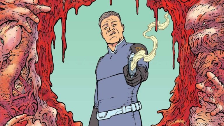 After the abject terror of The Creeping Below #1, it’s time for a palate cleanser with Skin Police #1. The long and short of it is that, by the year 2142, the world has to deal with Dupes, which are “genetic duplicates (that have) transform(ed) into psychologically unstable killing machines.” We follow the government’s “Skin Police,” which is a much cooler name than “Duplicate Identification and Capture Division” (that’d DICD, folks). And the art team (artist Daniel Gete and colorist Jason Wordie) don’t waste one second dropping us face first into the blood and guts of it all, managing to make the mere prospect of “undulating wall of melted, mutated human bodies” all the more horrific and vomit-inducing in practice. But there’s something else here (beyond the layers of blasted human biological material) — namely, the look of boredom-meets-irritation on the face of our DICD officer. As if all of this has become pedestrian or ordinary somehow, and there’s a kind of boredom to his work. That, to me, is the most terrifying prospect: with all the things we’ve done, good and bad alike, humanity still falls victim to its most base and bland tendencies. That the thing we’re most capable of is total disconnect with the world and the future, and that’s more grievous than all the Dupes ever. Now I think I’m scared and depressed.