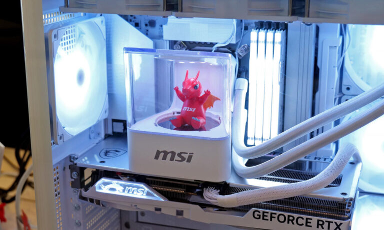 I completely agree that the fun of using a rotary table inside a PC may be lost on many people. But once again, watch as Lucky (the name of MSI’s dragon mascot) spins in place as the desktop moves around. What’s even better is that you can lift up the water block’s transparent lid and put whatever you like inside. Think of a luxury watch or mirror ball. Isn’t that a big deal, especially when you have RGB lights nearby? Honestly, the whole setup is kind of mesmerizing.