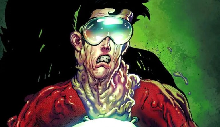 At least that would be a good argument, if not for a complete slide into darkness. The Justice League scenes remain simple and colorful, but the artists provide a surprising contrast every time the book reminds readers of Eel’s decaying body. Colors become duller, lines sharper, and detail creeps into every trace of Eel’s face. A simple Justice League scene cloaked in comedy and classic art style is shattered in the face of a devastating tragedy.