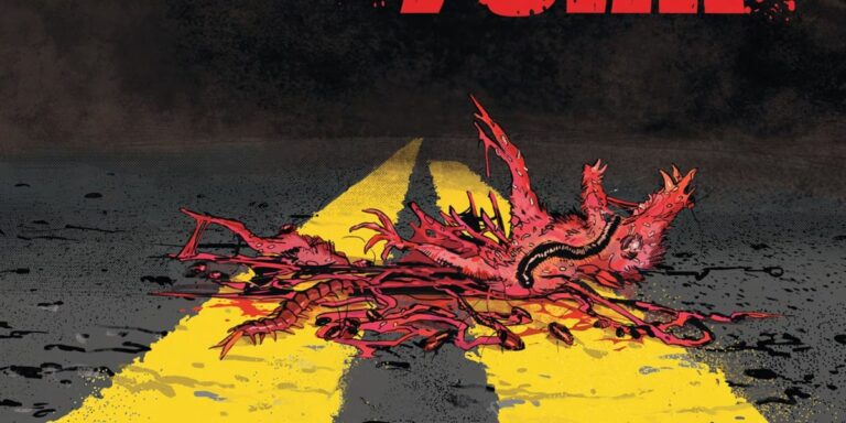 The artwork by Nil Vendrell and Giulia Brusco captures the roughness of the community incredibly well, capturing the descent into fear and more of the body. Vendrell’s style reminds me of Rafael Albukerque, Squared Off, Scratchy Carperty, and beautiful textured shadows, but with a bit more inclined to tendrils. Using a dark palette of colours, which uses dark shades of blue, red, green and brown as base, Brusco captures the town’s collapse and its unpleasant, almost sickly eerieness.