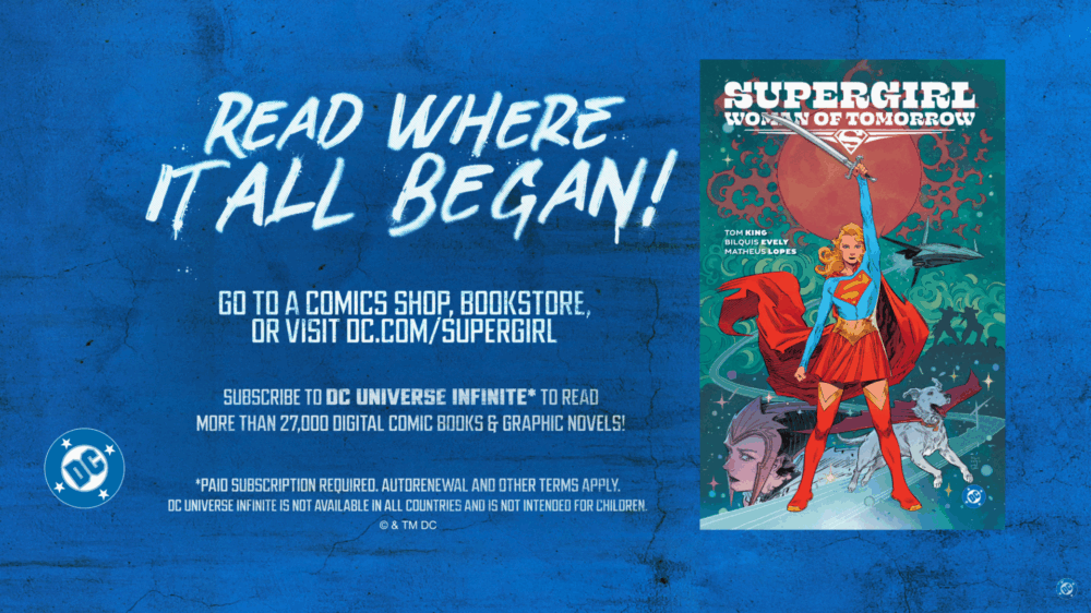 The trailer released earlier today ends with a call to action to “Read Where It All Began,” and includes an ad for DC Universe Infinite and a link to a landing page for DC’s Supergirl. The shot also features the cover of the miniseries Supergirl: Women of Tomorrow, which Tom King and Bilquis Evely’s film is based on.